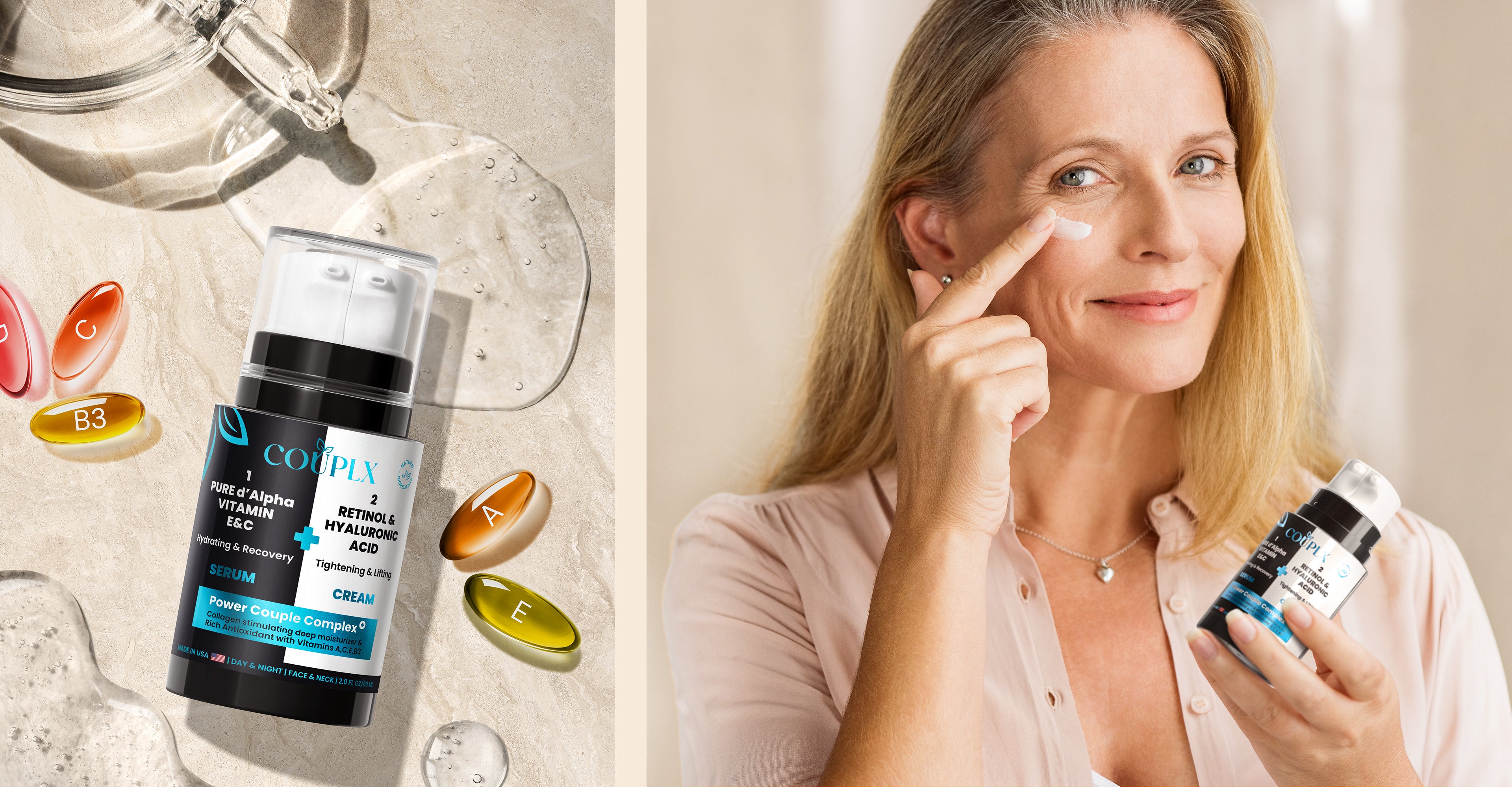 In one bottle with a retinol cream and a skin brightening serum for the face, neck, and décolleté. The 36 science-backed ingredients work together for a rejuvenating dual effect: women and men, day and night